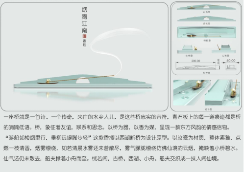 以橋為器,以香為媒,呈現一款東方風韻的情感信物。 “游船如梭煙里行,垂柳遠堤腳步輕”,這款香插以西湖斷橋為設計原型。以汝瓷為材質,整體素雅,點燃一枝清香,煙霧繚繞,如若清晨水霧還未曾散盡,霧氣朦朧繚繞仿佛仙境的云煙,掩映著小橋碧水。
