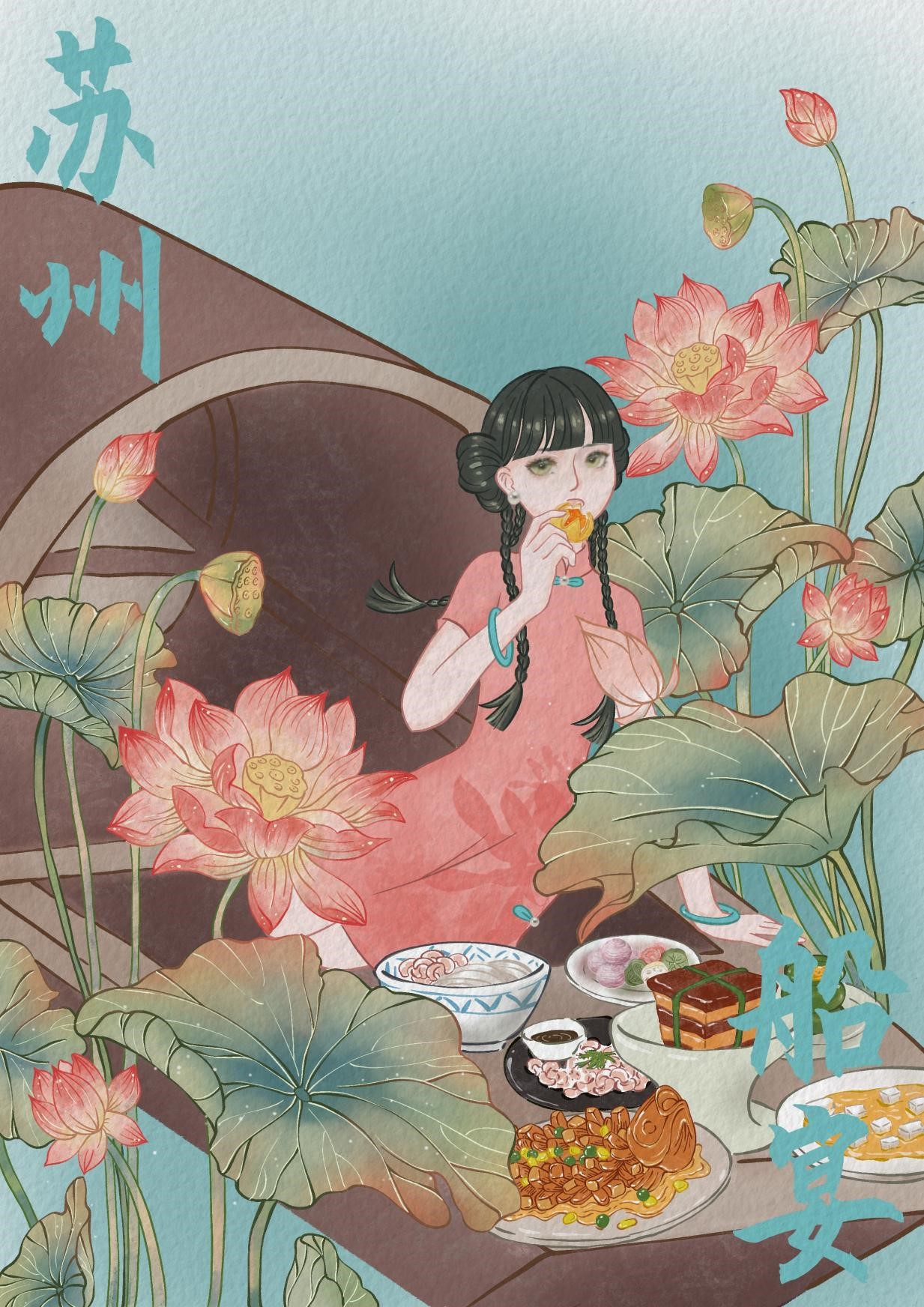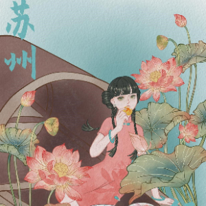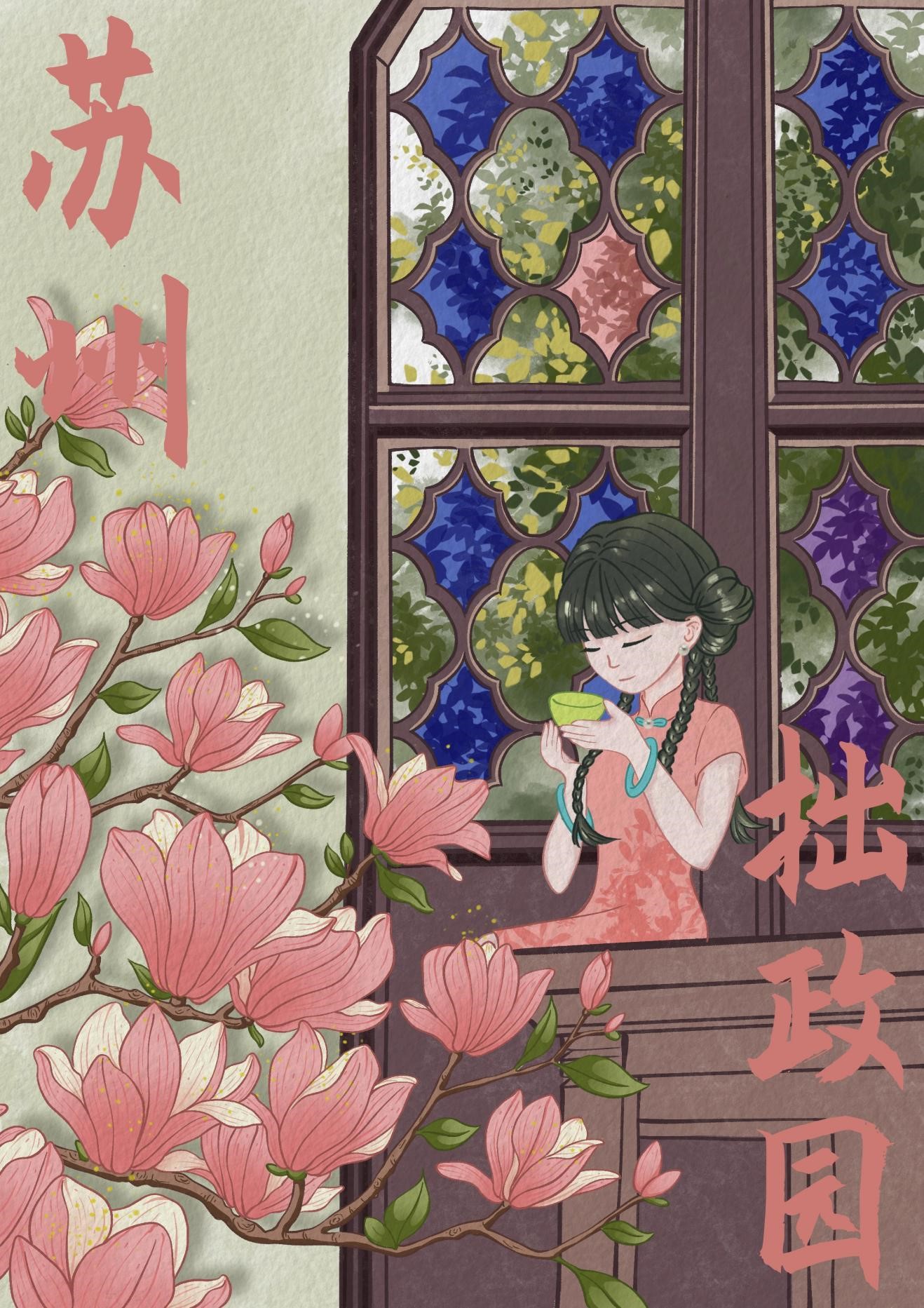 文創設計運用了蘇州的建筑拙政園、獅子林、留園,蘇州的植物玉蘭花、紫藤花、紅山茶、荷花,蘇州的非遺文化碧螺春茶、古琴、玉雕、烏篷船宴的元素,將IP形象人物“扶桑”與蘇州元素結合起來,以插畫的形式呈現出蘇州濃厚的中華文化氛圍以及優美的園林風景。