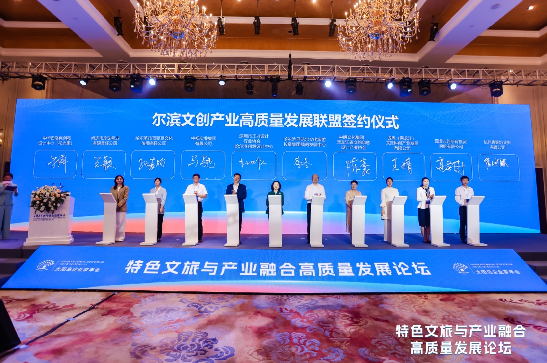 8月23日上午,2024太陽島企業家年會·特色文旅與產業融合高質量發展論壇在哈爾濱市太陽島花園酒店舉行。圖為爾濱文創產業高質量發展聯盟簽約儀式