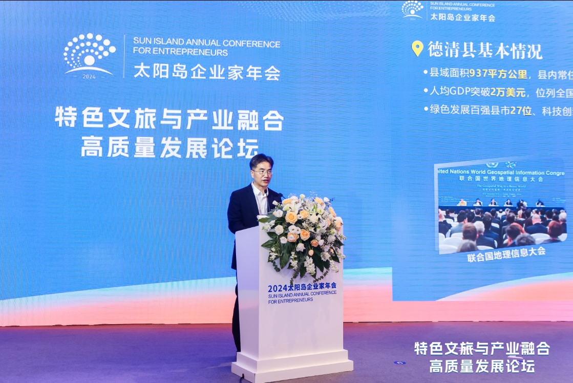 8月23日上午,2024太陽島企業家年會·特色文旅與產業融合高質量發展論壇在哈爾濱市太陽島花園酒店舉行。圖為德清縣委常委、宣傳部部長周志方分享特色文旅案例