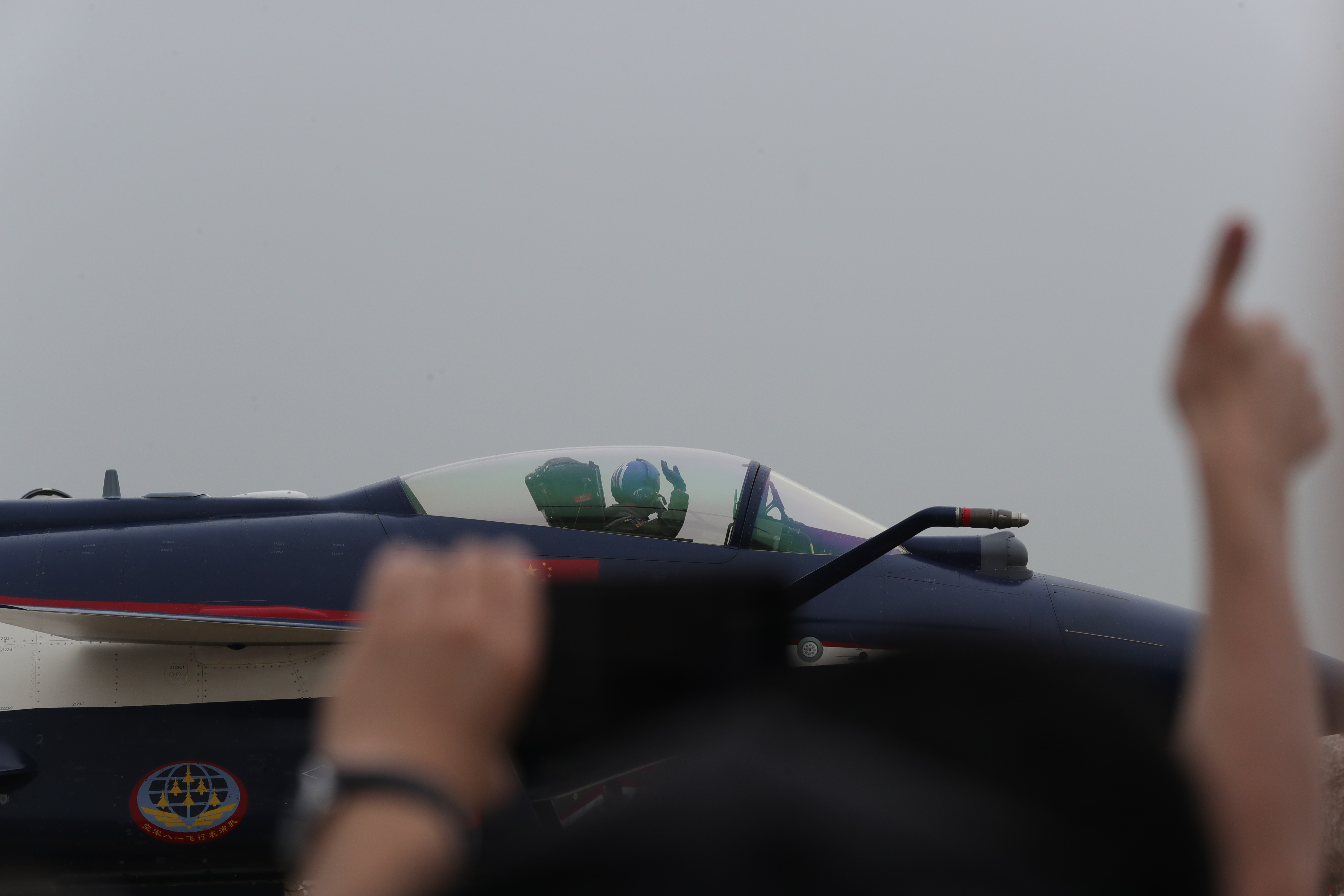 11月13日,空軍八一飛行表演隊飛行員在珠海航展上向觀眾致意。新華網 丁梓朔攝