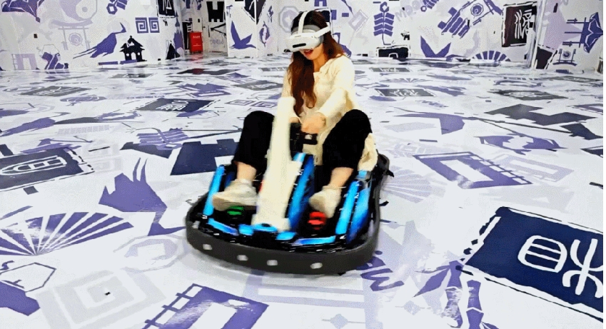 在傳統卡丁車的基礎上,戴上頭顯“跑酷”,穿上體感背心,通過振動感受“中彈”,一鍵“穿越”到不同的虛擬賽道,同時還能實現多人在線競技。車機與游戲引擎深度融合,能實現精準的震動控制,模擬各類路況,同時模擬各類受擊體感。