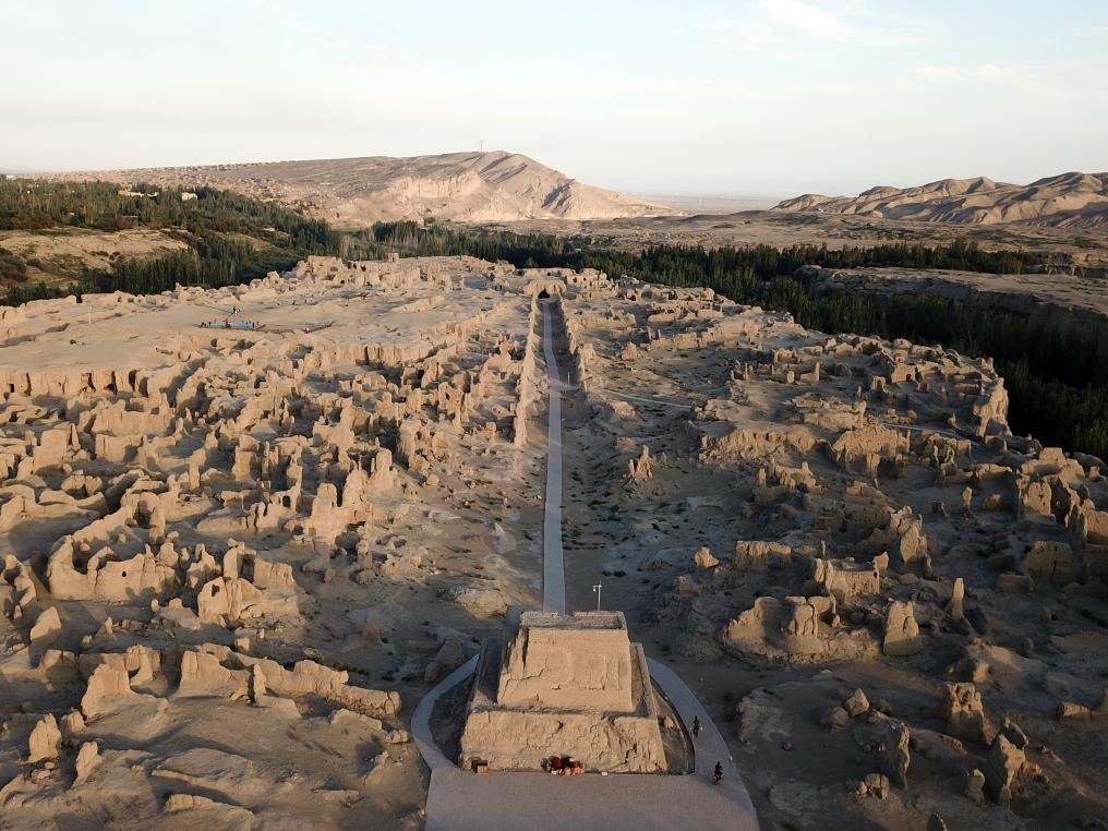 站在新疆吐魯番交河故城的觀景臺上俯瞰,護城河道綠樹如茵、禽鳥成群,如一條玉帶環繞著這座世界上最大最古老、保存最完好的生土建筑城市。