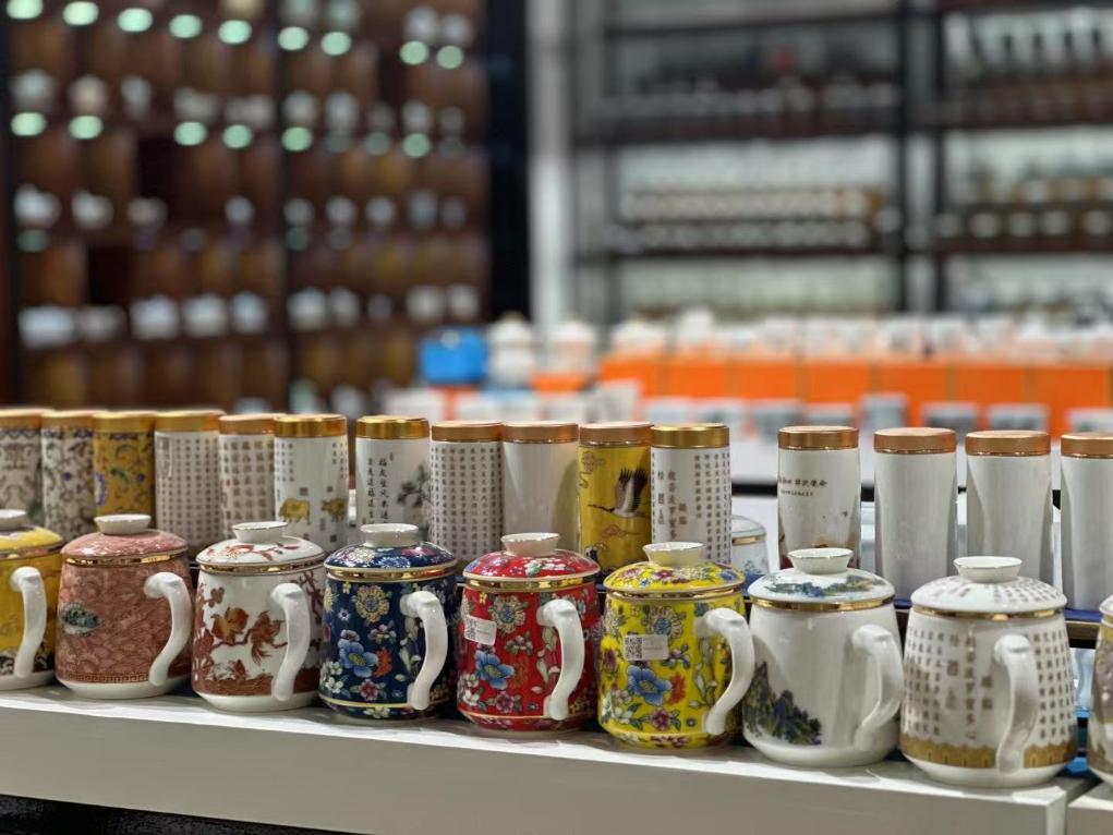 如今,茶具城有600多家店鋪,茶盞、茶杯、茶漏……各類陶瓷茶具應有盡有。許多商家還將商鋪內外分隔,外間用來展示產品、接待顧客,里間則進行直播帶貨、線上銷售。