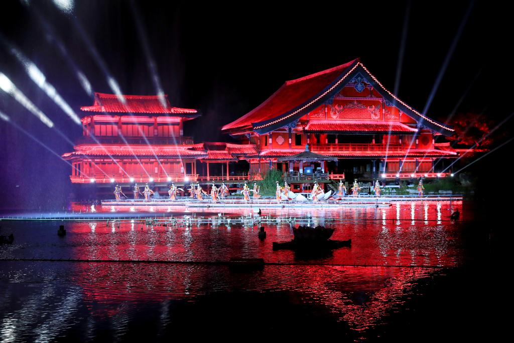 8月27日晚,演員在湖北襄陽唐城景區表演。