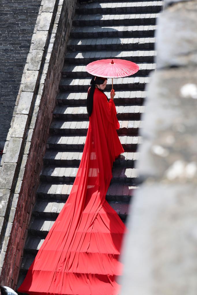 9月12日,一名游客在西安城墻上拍照。