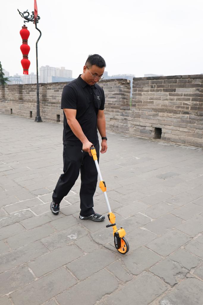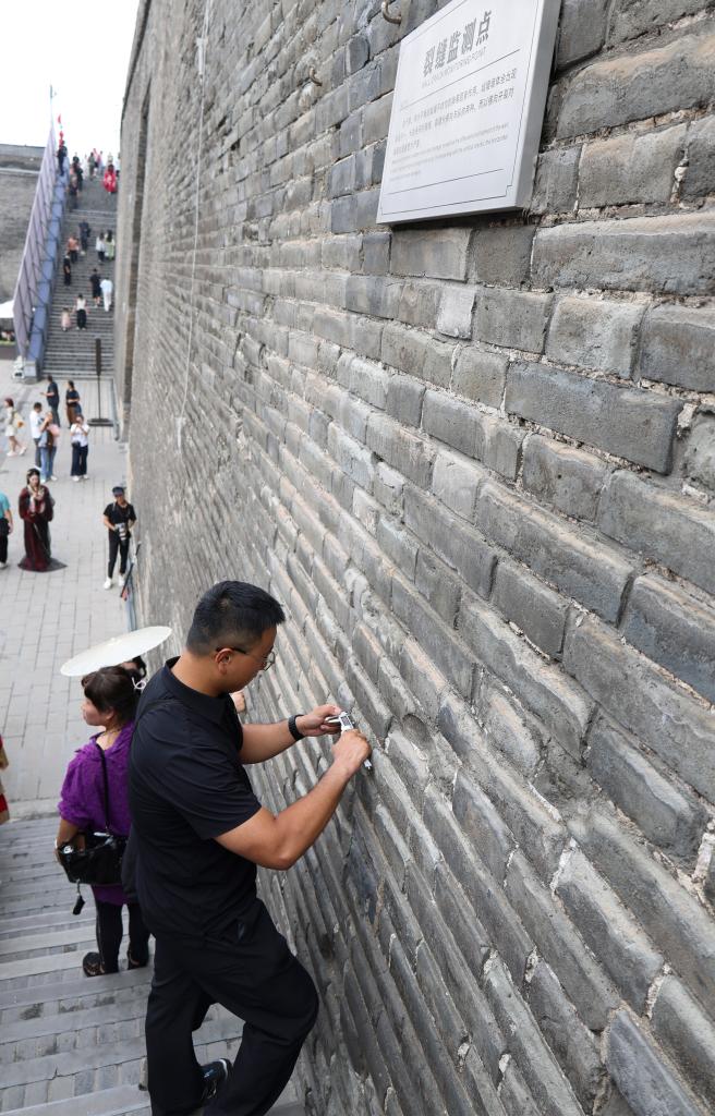 9月10日,一名文保巡查員在西安城墻上測量甕城東踏步墻體裂縫寬度。