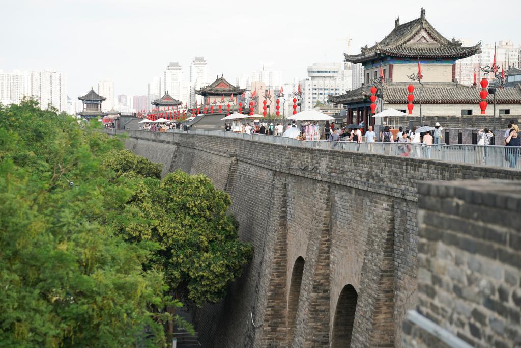 9月12日,游客在西安城墻上游覽。
