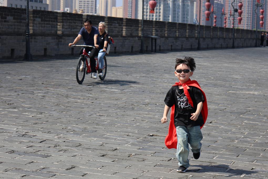 9月12日,一名小朋友在西安城墻上奔跑。