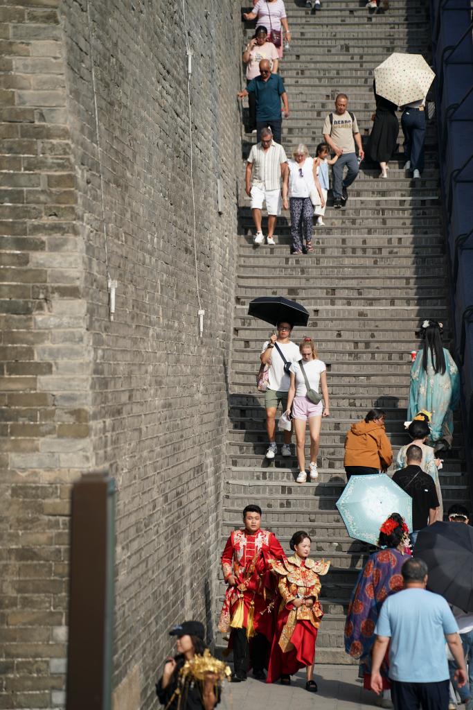 9月12日,游客在西安城墻永寧門內游覽,左側城墻上布設著墻體裂縫監測儀。