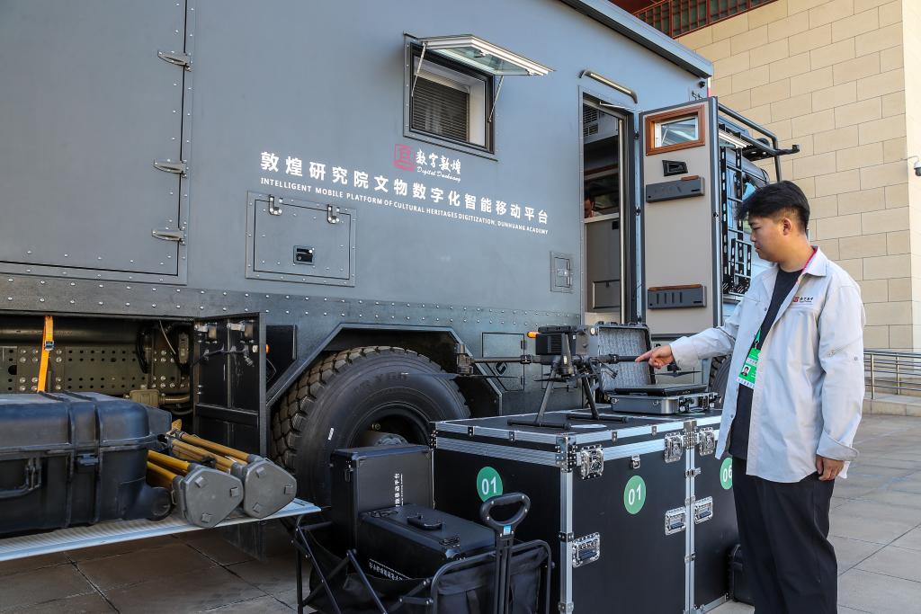 9月22日,在敦煌研究院“典范”“高地”建設成果展上,工作人員介紹敦煌研究院文物數字化智能移動平臺及其配套設備。