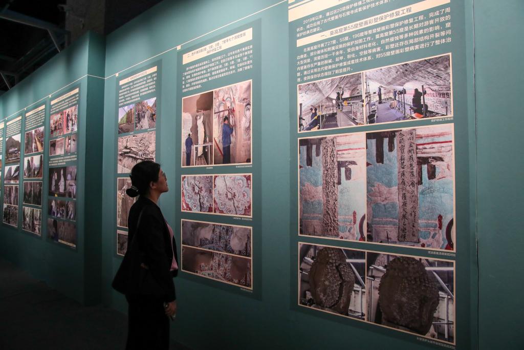 9月22日,在敦煌研究院“典范”“高地”建設成果展上,一名嘉賓在觀看莫高窟壁畫彩塑保護修復工程簡介。