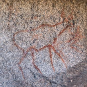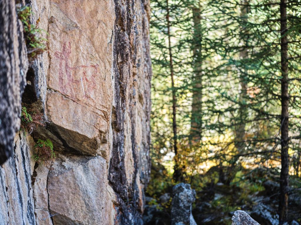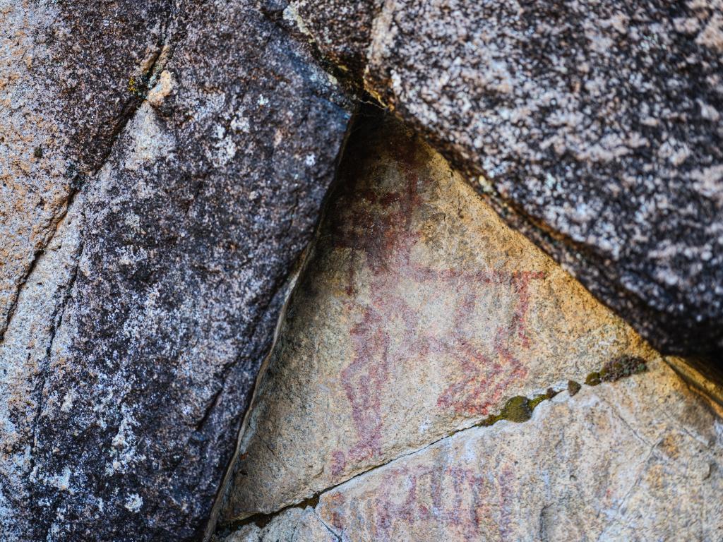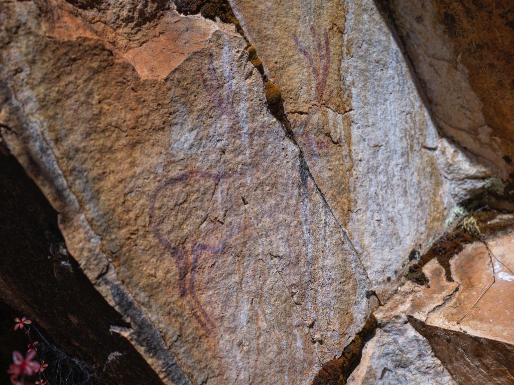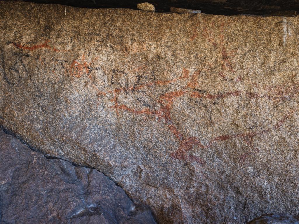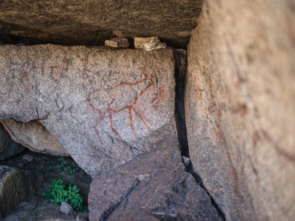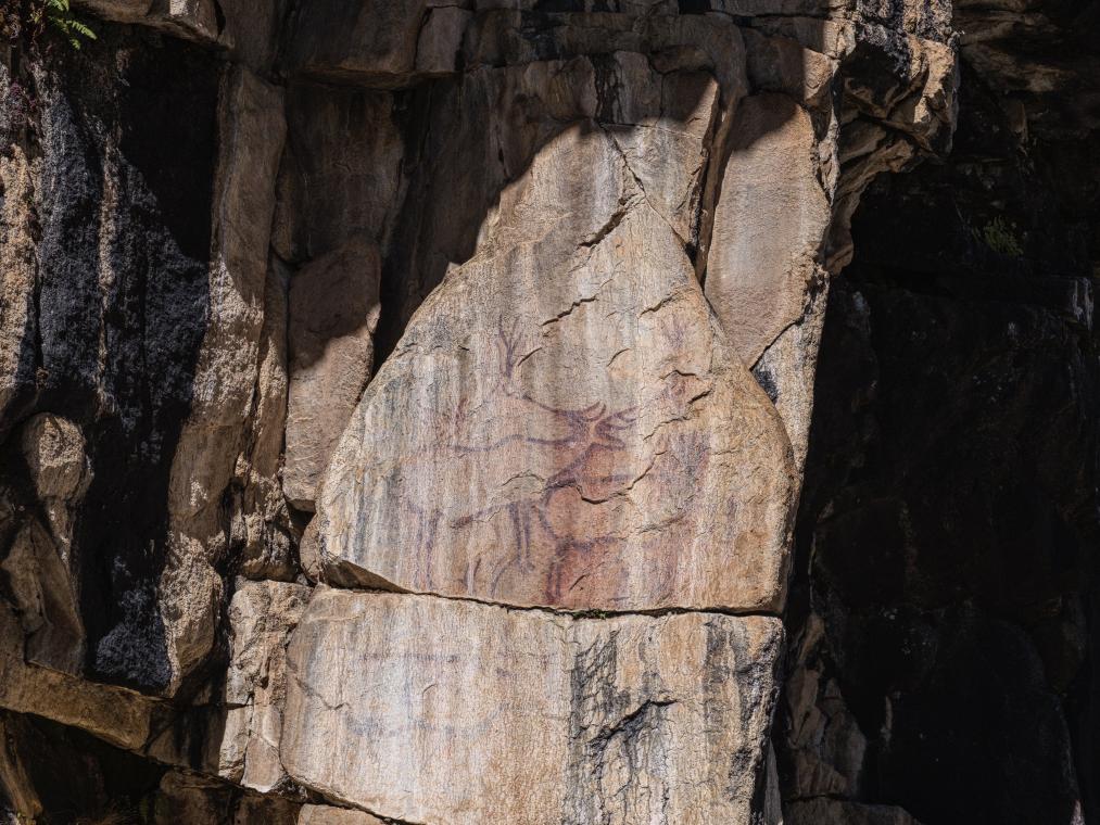 10月21日拍攝的久乃巖畫。該巖畫由紅顏料涂繪的十余幅鹿形圖像和若干抽象圖案組成。
