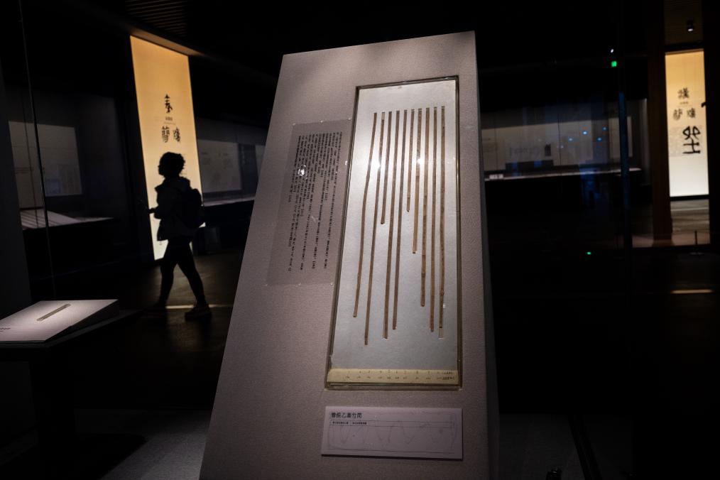 1978年在湖北出土的曾侯乙編鐘早已蜚聲世界,而曾侯乙墓出土竹簡則鮮為人知。本次展覽罕見地展出距今約2400年的曾侯乙墓竹簡,成為一大亮點?!霸钜夷怪窈喪瞧癜l現的時代最早的竹簡,時代在戰國早期?!焙笔〔┪镳^學術研究中心副主任羅恰介紹,這批竹簡均出自墓葬北室,與兵器、皮甲等放在一起,內容為遣策,主要是關于喪葬時所用車馬的記載。
