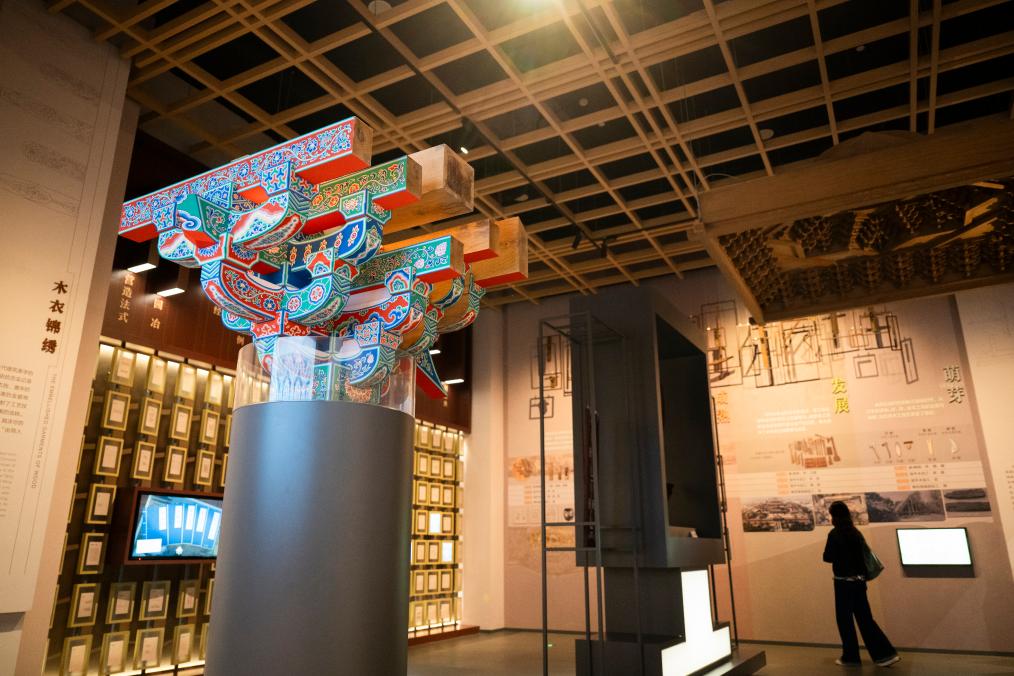 走進展廳,“牢而不固”的各式榫卯,“墻倒屋不塌”的抬梁式與穿斗式框架,兼具結構承重與裝飾功能的層疊斗拱,穹頂上精美繁復的藻井等,令人目不暇接,展現出我國古建營造技藝的精妙。
