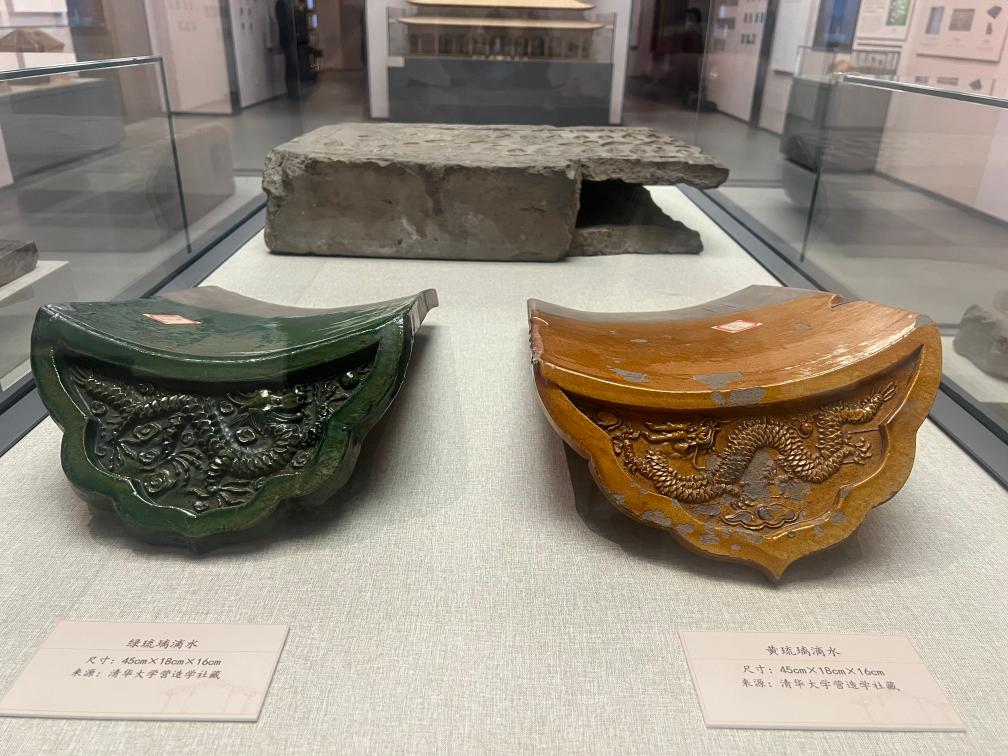 展覽的中心位置,集中呈現了16件中國營造學社在古建調查中珍藏的樣本,這也是這批樣本首次走出清華大學、來到武漢展出。透過展柜可以看到,漢千秋萬代印文磚紋路清晰,黃釉、綠釉琉璃滴水上的淺浮雕云龍紋姿態靈動,5件中國營造學社題寫殘片字跡可辨,無一不訴說著中國營造學社調查古建的足跡。