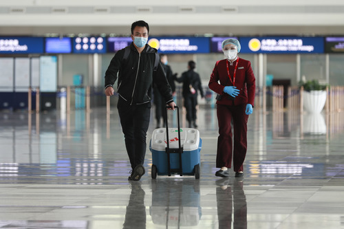 2020年4月24日,武漢協和醫院心外科醫生盧雄豪(左)運送來自山東的供肺抵達武漢天河機場。疫情期間該航班取消,移植團隊與中國國際航空公司取得聯系告知這一情況后,該公司緊急啟動綠色通道,重新開通此航班。新華社記者 沈伯韓 攝