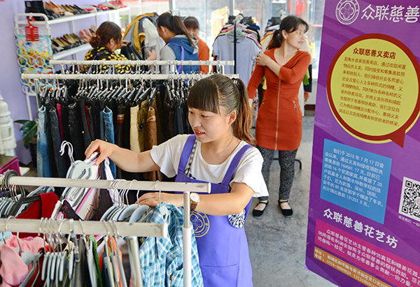 圖為河北衡水市桃城區眾聯慈善義賣店店員在整理熱心市民送來的衣物