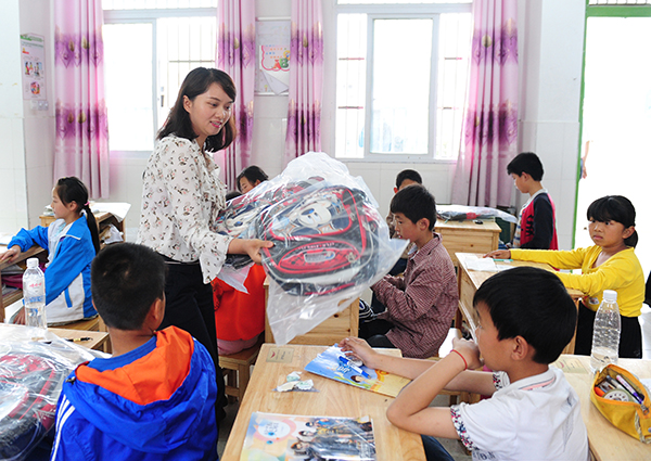圖為蘇明娟給母校金寨三合實驗學校的學生們發放禮物