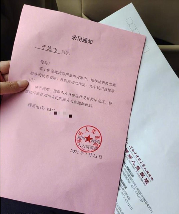 7月22日,鄭州人民醫院在了解于逸飛地鐵救人的光榮事跡后,決定對于逸飛免試用直接錄用。網友們紛紛點贊:恭喜醫院招到了一位好醫生。