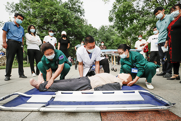 9月11日,醫務人員在河北唐山遵化市遵化鎮南關村社區公園進行傷員運送急救演練。新華社發(劉滿倉 攝)