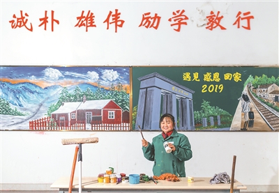 一次機緣巧合,她畫起了學生公寓的黑板報。忙碌之余,拿出時間畫一幅黑板報,有時站6個小時創作一些作品,內心也總是快樂的。她說,“一畫起來,就忘記了累”。