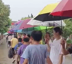 在大連莊河市,大雨傾盆而下,考生即將進入考場,民警、老師、考點工作人員自發撐起了30米長的“斜式傘橋”?!皹颉钡囊欢诉B著送考校車,另一端連著考點教學樓大門;雨傘齊刷刷地向考生傾斜,撐傘者的后背卻“泡”在了雨水里。有網友留言說,“這是愛在‘傘傘’發光!”