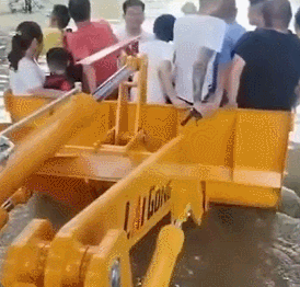 在湖北襄陽,路面積水,行人車輛無法前行,一男子見狀開來鏟車,載著上班的市民送至路對面,解決了大家的燃眉之急。