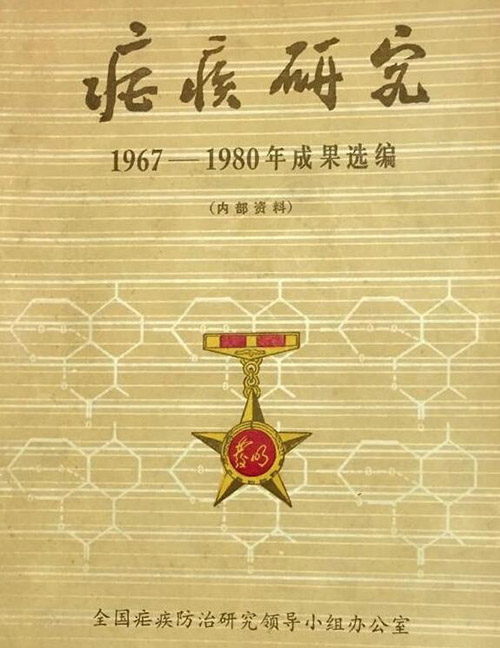 這本《瘧疾研究:1967—1980年成果選編》的封面上,印有一枚閃亮的勛章,勛章下的底圖是白描的分子結構。