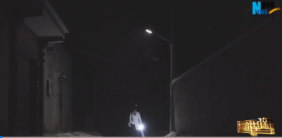 雪夜,一盞路燈,一只手電筒,一位身著白大褂背著藥箱的男子,獨自行走在鄉間小路上。