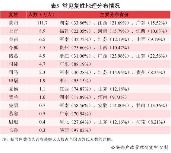 復姓“歐陽”33.86%的人口分布在湖南;復姓“皇甫”32.72%的人口分布在河南;復姓“諸葛”31.06%的人口分布在浙江;復姓“司徒”88.19%的人口分布在廣東;復姓“司馬”30.28%的人口分布在河南;復姓“夏侯”74.87%的人口分布在江西。