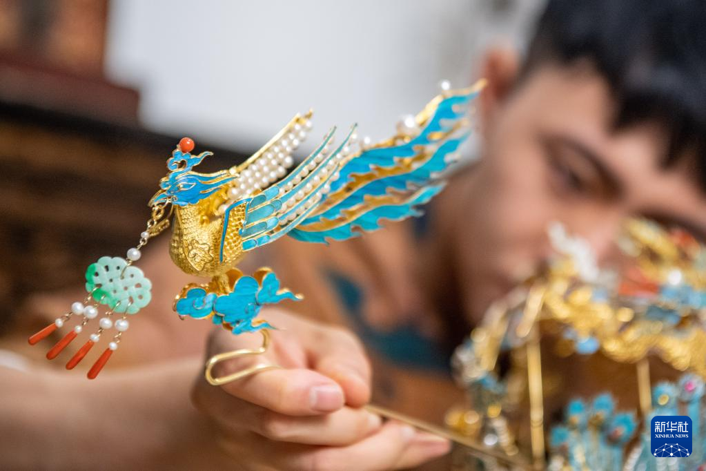 2022年6月9日,“90后”重慶小伙辜國強在組裝花絲鑲嵌作品“鳳引九雛”?;ńz鑲嵌工藝是一門傳承久遠的中國傳統手工技藝,2008年被列入國家級非物質文化遺產名錄。7年前,大學畢業不久的辜國強偶然接觸到花絲鑲嵌技藝并迅速愛上了這門古老的手藝。拜師學成后他建立了工作室,探索利用這門傳統工藝制作適合現代人佩戴的飾品,以創新的手段重塑老技藝,讓傳統工藝煥發新生機。
