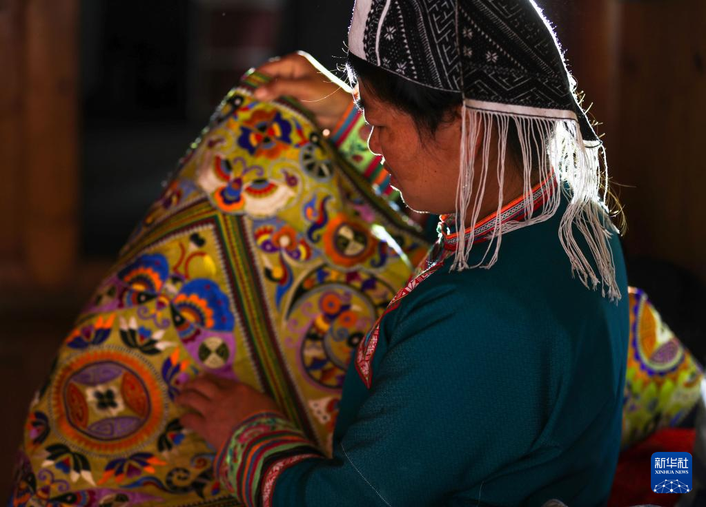 2022年5月2日,村民在貴州省榕江縣塔石鄉烏吉苗寨檢查苗族繡品。烏吉苗寨是黔東南州苗族蠟染刺繡非物質文化遺產生產性保護示范基地。近年來,當地積極挖掘苗族刺繡、蠟染等“非遺”技藝,帶動村民從事苗族傳統刺繡、蠟染等手工制品生產與外銷,實現“非遺”傳承與市場對接,走出一條傳統“非遺”助力鄉村振興的新路子。