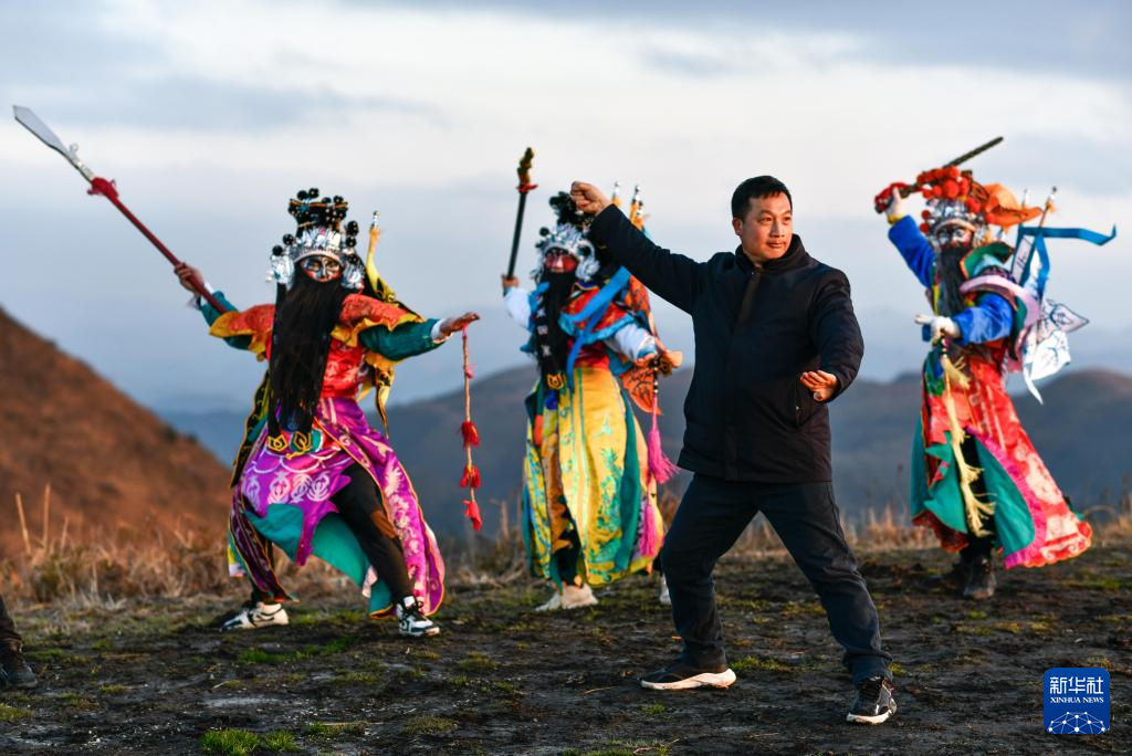 2022年2月7日,在貴州省黔南布依族苗族自治州龍里縣龍山鎮,“龍里太平花燈”藝人劉江(前)在村附近的山頂上指導年輕人練習花燈戲?!褒埨锾交簟笔橇鱾饔谫F州省龍里縣龍山鎮的一種古老戲曲劇種,在當地政府的保護與支持下,已傳承發展出“生旦凈丑”劇唱、臺上臺下互動表演等多種表演形式。