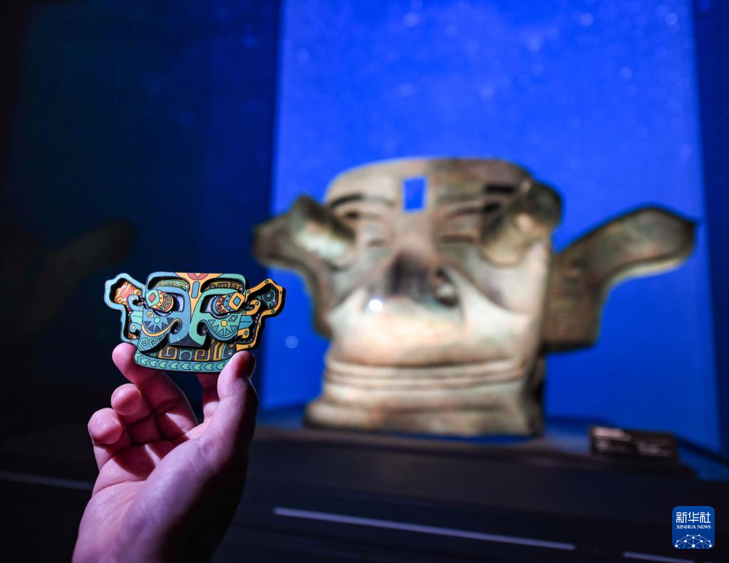 這是2022年5月16日在三星堆博物館拍攝的青銅縱目面具文創冰箱貼。近年來,三星堆遺址重要考古發現成果陸續公布,帶動三星堆博物館的文創產品設計銷售熱潮,一些文創產品取材于發掘出土的金面罩、青銅器等文物,受到人們的歡迎。