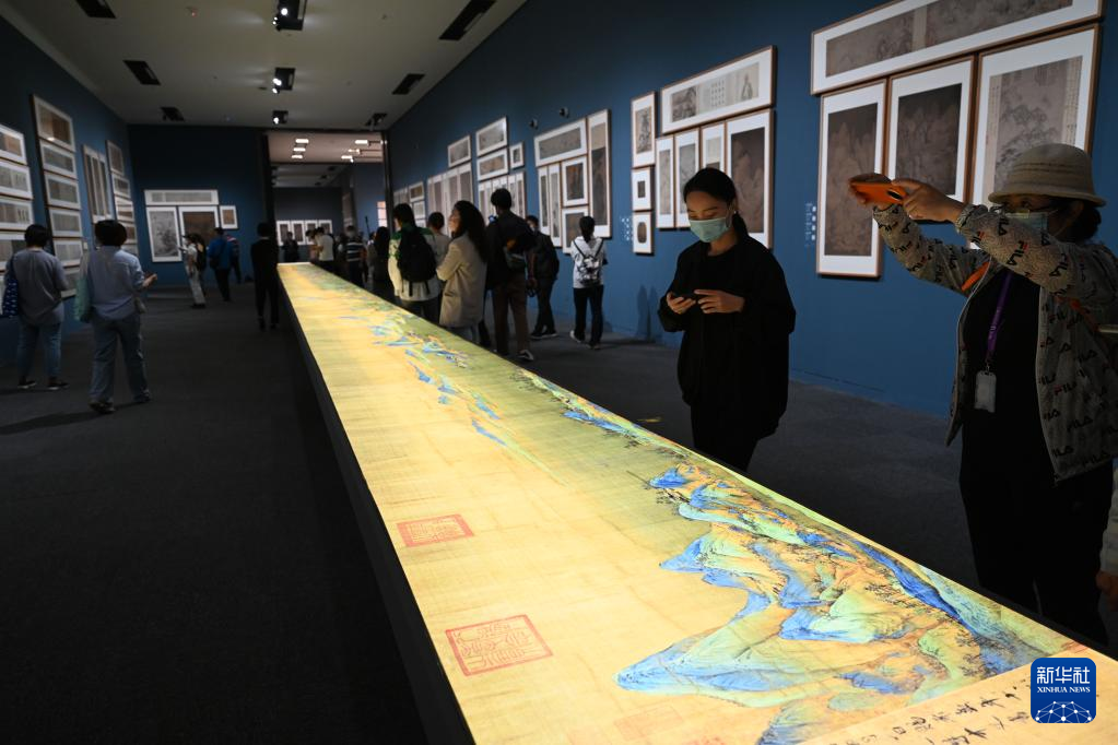 2022年9月29日,“盛世修典——‘中國歷代繪畫大系’成果展”在位于北京的中國國家博物館開幕,觀眾在展覽上參觀放大兩倍的《千里江山圖》燈光特效圖。