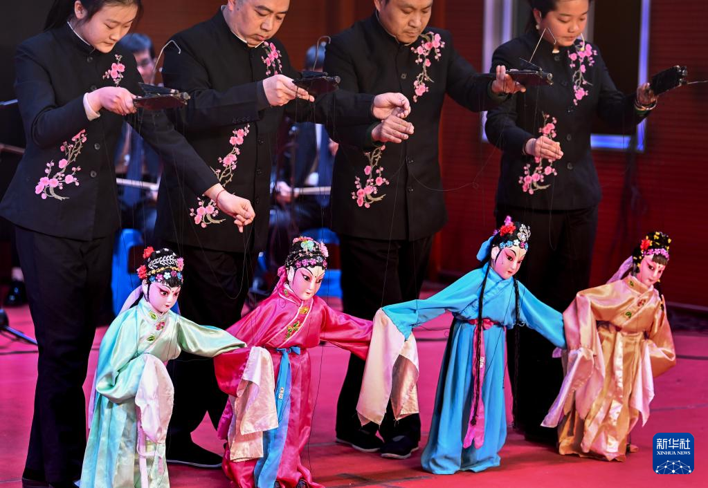 2022年3月4日,陜西省合陽縣線腔木偶劇團的演員在合陽縣文化館演藝廳內為觀眾表演提線木偶劇《鬧春》。近年來,陜西省合陽縣積極出臺扶持政策,在當地開展“非遺進校園”、恢復傳統劇目演出、開設免費“周末劇場”等方式,讓居民領略傳統非遺的魅力,支持合陽提線木偶煥發生機與活力。