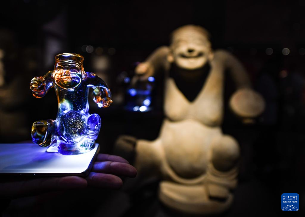 這是2022年5月17日在成都博物館拍攝的漢代陶說唱俑和其文創產品(左)。近年來,成都博物館打造文創品牌,培育孵化優秀文創產品。文創產品設計師通過對“鎮館之寶”石犀、漢代陶俑等文物進行多元化設計,將文物變成“萌物”,廣受人們的歡迎和追捧。