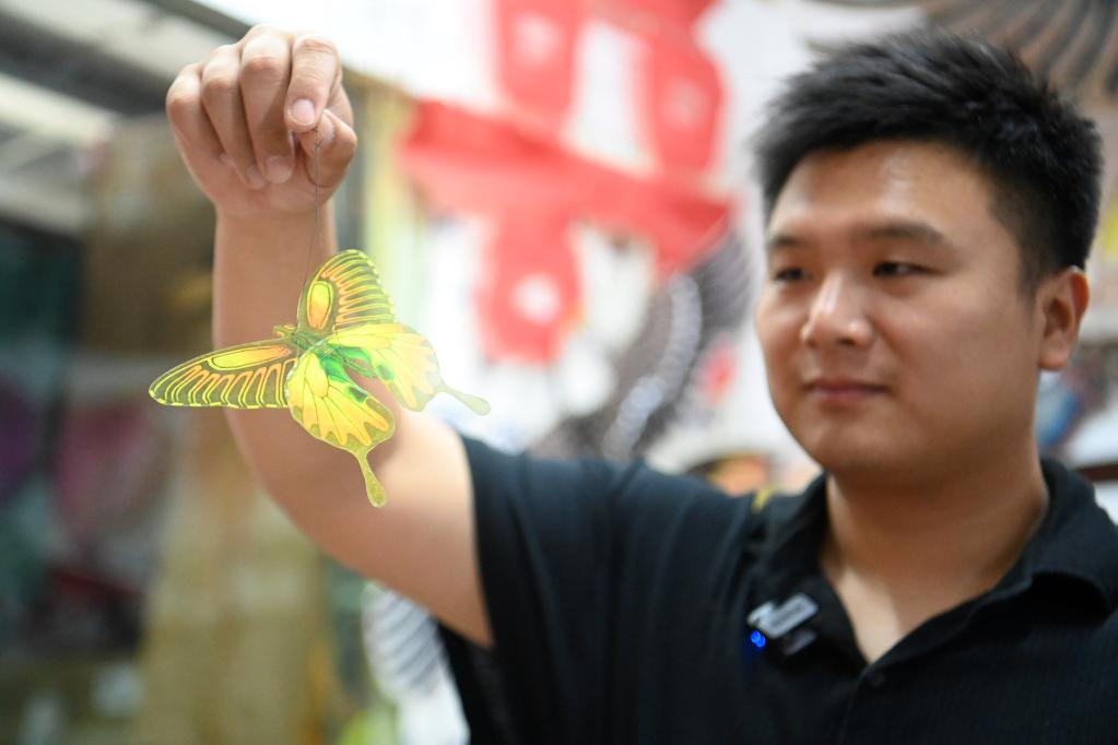 出身風箏世家的魏博文大學畢業后,回到家鄉跟隨父親魏國秋“入行”做風箏。他從自己有所基礎的繪畫著手,發揮年輕人的創新優勢,在風箏設計上屢屢出新,不僅與一些游戲公司合作推出風箏聯名款,還推動風箏制作技藝的改進創新,設計了適合在室內放飛的迷你風箏。