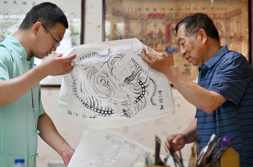 在天津市西青區的楊柳青霍氏古一張畫店,霍樹林(左)和父親霍慶有交流下一階段的年畫制作(6月6日攝)。