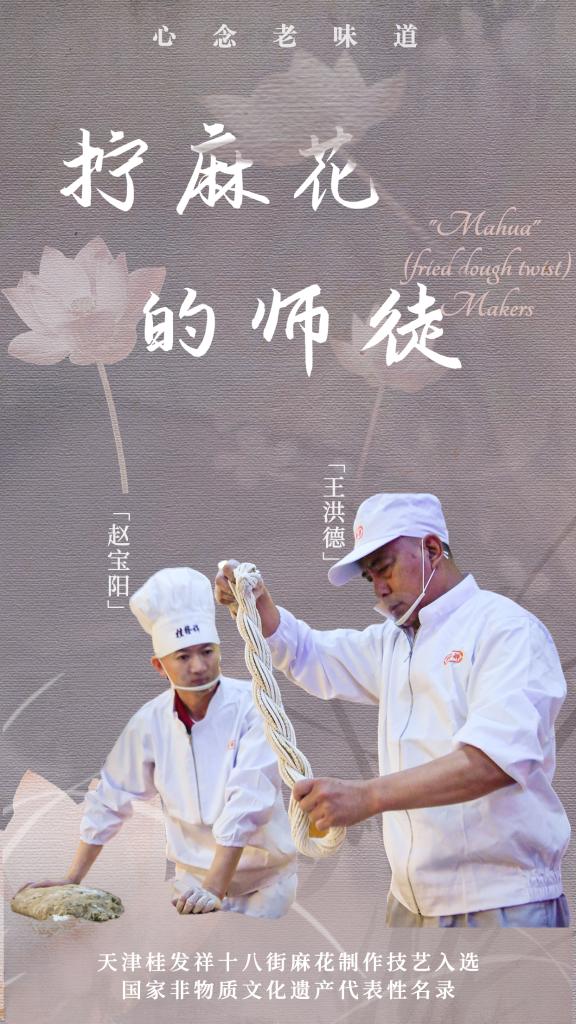 32歲的趙寶陽是王洪德的徒弟。10年前,趙寶陽抱著探索十八街麻花香味密碼的好奇心來到桂發祥,向老師傅學習請教,成為了一名傳統手工麻花制作的青年傳承者。經過不斷學習積累,趙寶陽在王洪德的指導下成長為麻花生產車間副主任,并開始帶著更多的年輕人,向他們傳授傳統手工麻花的制作技藝。