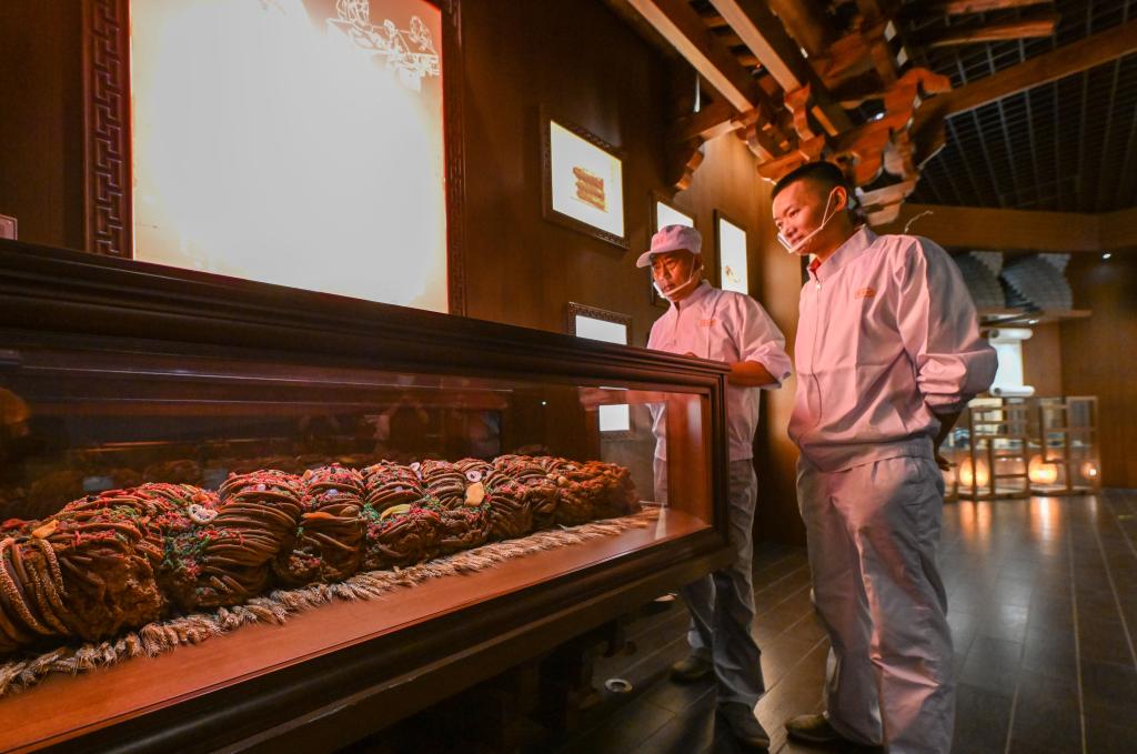 在天津桂發祥十八街麻花文化館,王洪德(左)和徒弟趙寶陽欣賞重達百斤的巨型麻花(6月8日攝)。