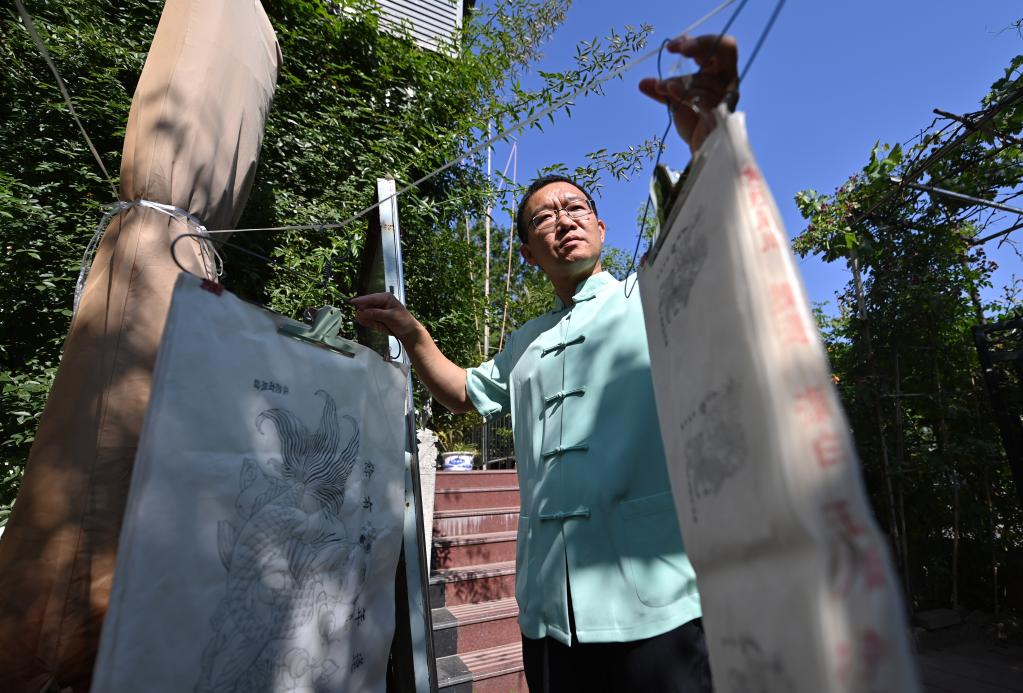 在天津市西青區的楊柳青霍氏古一張畫店,霍樹林把印好的“畫坯子”進行晾曬(6月6日攝)。