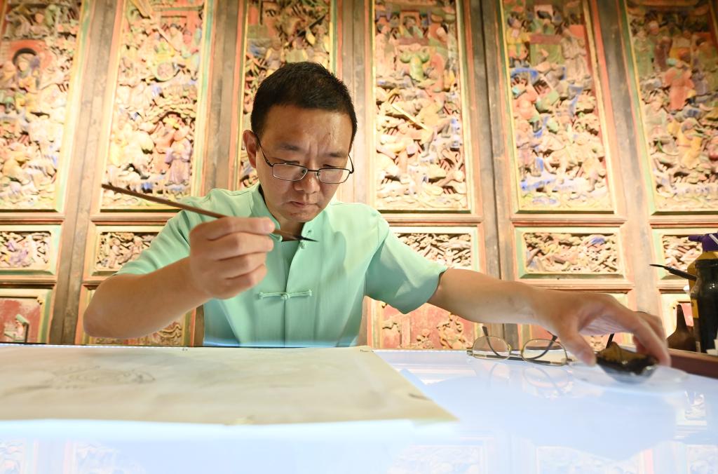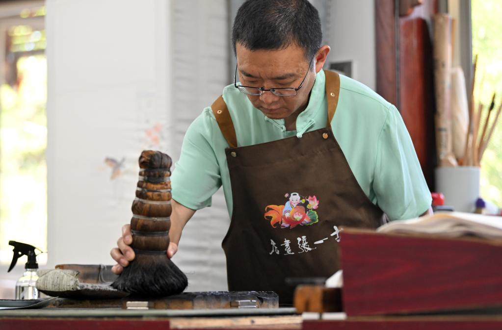 霍樹林在天津市西青區的楊柳青霍氏古一張畫店進行刷墨(6月6日攝)。