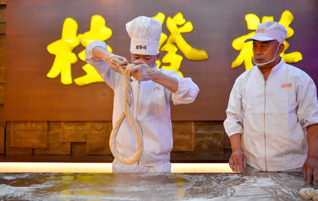 在天津桂發祥十八街麻花文化館,王洪德(右)為徒弟趙寶陽展示搓制成型的麻花(6月8日攝)。