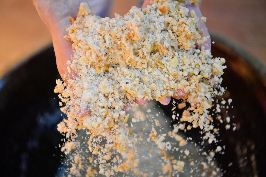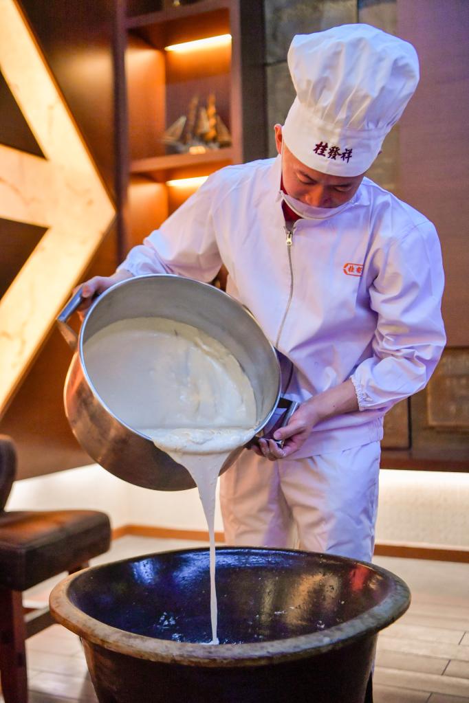 在天津桂發祥十八街麻花文化館,趙寶陽為手工麻花制作準備餡料(6月8日攝)。