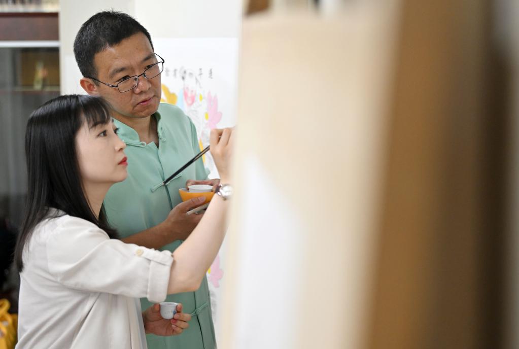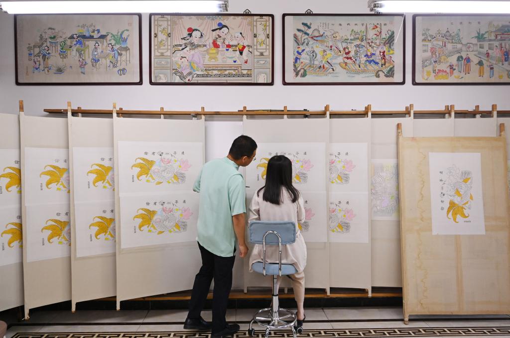 在天津市西青區的楊柳青霍氏古一張畫店,霍樹林(右)和妻子王丹一起進行彩繪(6月6日攝)。