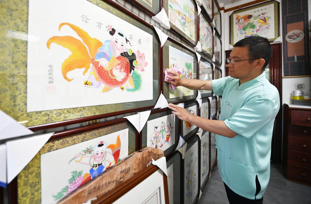 在天津市西青區的楊柳青霍氏古一張畫店,霍樹林在用布擦拭畫框(6月6日攝)。