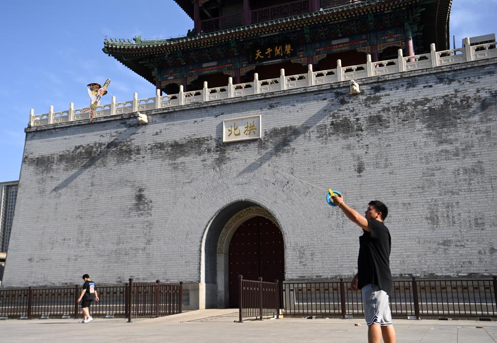 在天津市鼓樓附近,魏博文在放飛一架制作完成的風箏(6月8日攝)。