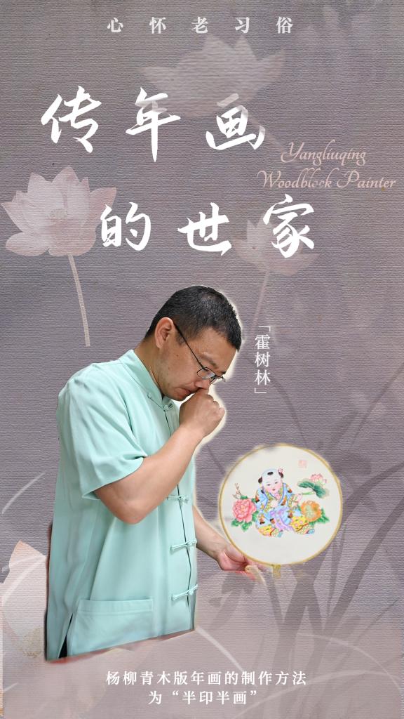 今年42歲的霍樹林因為出生在年畫世家,從十歲就開始跟著父親霍慶有——楊柳青木版年畫國家級代表性傳承人學習彩繪,中學時接觸勾線、刻版、印畫等,參加工作以后堅持磨煉裝裱技藝。